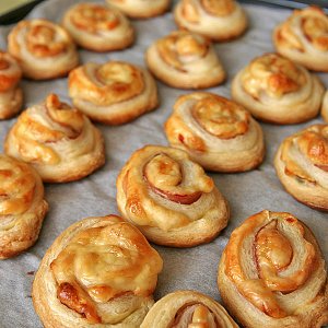 Mientras el horno se está precalentando a 200, extendemos la masa de hojadre, repartimos el jamón y el queso, lo enrrollamos a modo de brazo de gitano y vamos cortando rebanadas de 1 a 2 cm, batir el huevo con la ayuda de un pincel pinatarlas y al horno a 200 durante 15 minutos.
