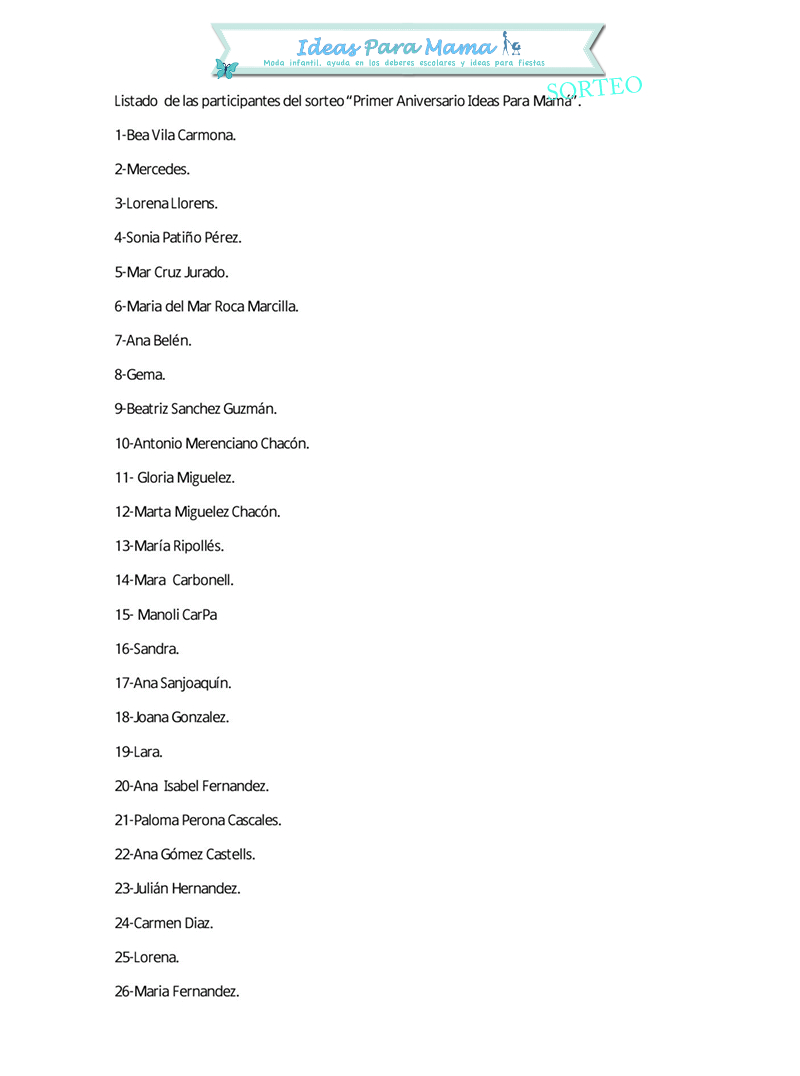 Hola mamis! Está el listado para nuestro sorteo, no es definitivo ya que hasta el 3 de Enero estaremos sorteando regalos, debes de dar me gusta a todas las firmas participantes, aunque ya esté sorteado el regalo que ofrece, debéis de dar me gusta , a todas las firmas y ya está, a participar…!en los sorteos que nos queden, las fechas son: Topolinos:23 de diciembre. NoraNorita Nora:26 de diciembre. Juguetes y bebes:30 de diciembre. El Rincón de Isabel: 2 de enero. Micaela&Micaelo: 3 de enero.